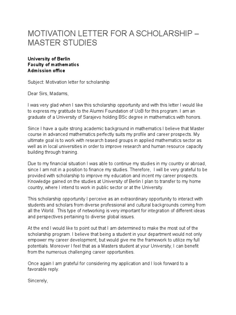 A scholarship motivation letter can make your application to be accepted or rejected. A motivation letter for scholarship can decide the fate of your application. Dear sir, i belong from a remote under developed village from bahawalpur (south punjab). They are the address, introduction, body and the conclusion. The motivation letter is what sets you apart from the rest when applying for a scholarship.